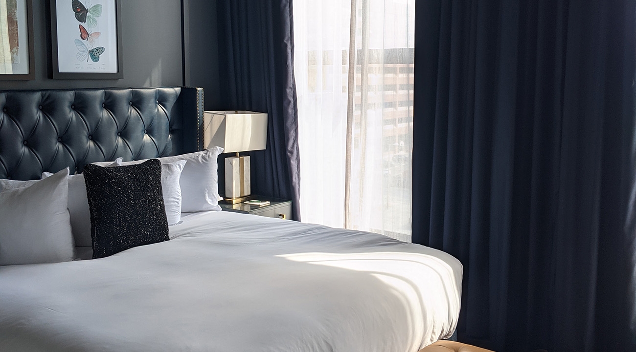 That space is now home to bar and restaurant The Wild Swann, named in tribute to a later building resident, the Swann Abrams Hat Company. One beauty of such a historic property is the wonderfully high ceilings, which are fully showcased in the 51 guest rooms via floor to ceiling windows and modern chandeliers. Each room is spacious, with ivory white linens contrasting with accents of navy wood panelling and plush leather headboards.