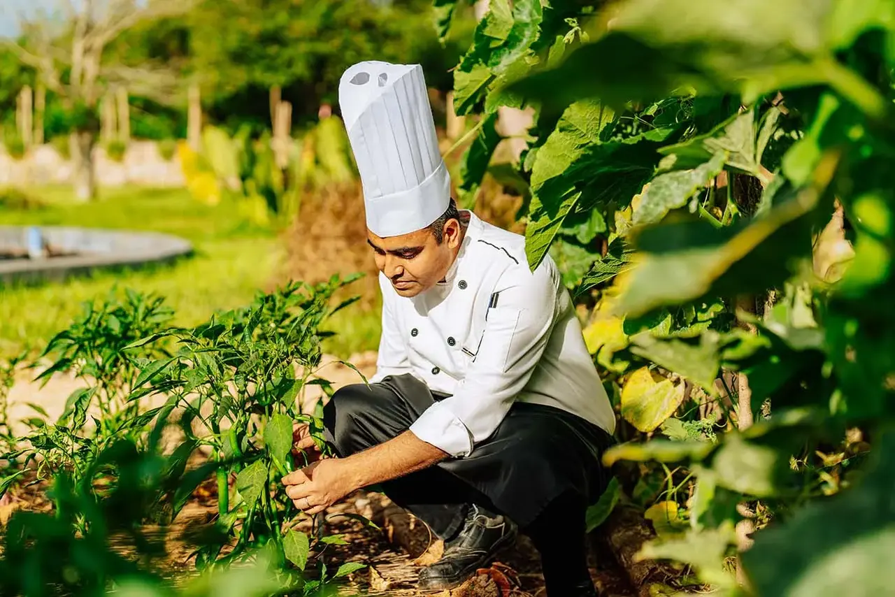 We walk around the gardens, picking okra, mint and chilli peppers, before making our way to the beach, where we whip up a medley of king fish, prawn and butternut squash curries infused with punchy spices.