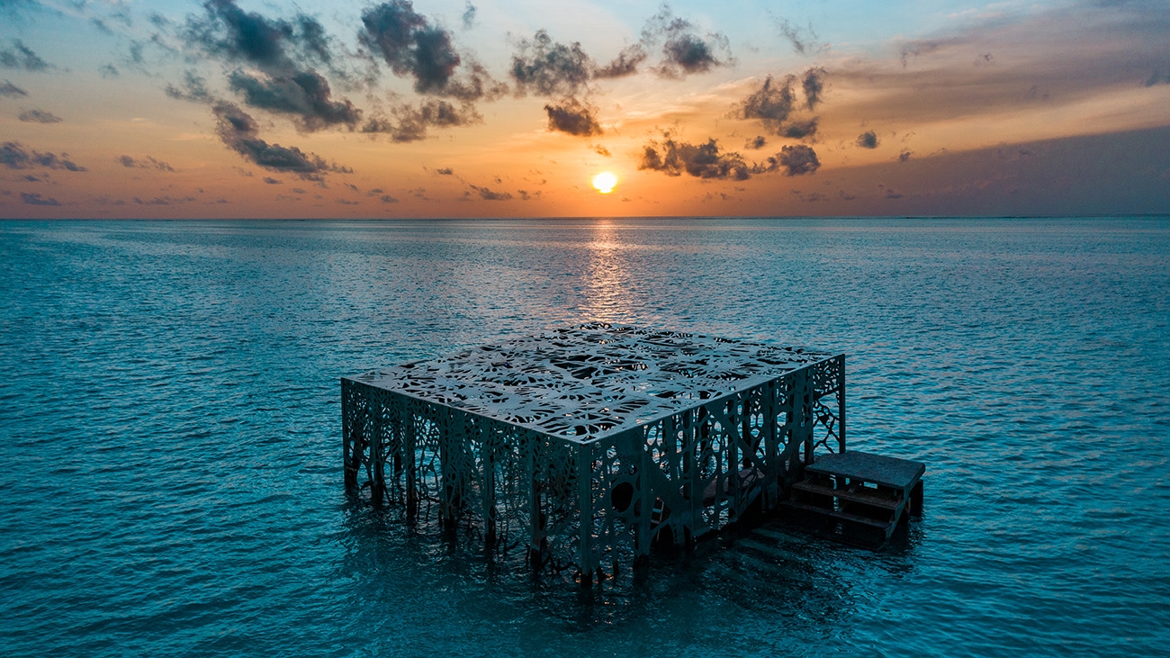 S: The Coralarium is the world's first semi submerged art gallery, but also the first coral regeneration project in the Maldives in the form of an art installation. It was all made using PH-neutral materials, so it's non-toxic to the environment and it contains no harmful pollutants for the marine life. The structure was designed to catch vital biomass and coral larvae so coral would naturally begin growing on the structure. So now what you find three years later after completion is that it's now covered in lots of baby coral, which has attracted a wide variety of fish and marine life. Because it's such a USP for the resort, it's a great opportunity for me to explain to guests about coral, the coral reef ecosystem, and the threats and dangers posed towards it. I can also invite them to help me with coral conservation - we are doing a coral nursery project where guests can help attach baby coral fragments that are broken off from the reef. [They] can attach them to a coral frame, put their name on the frame and then we send them photo updates every three months about how their coral frame is doing, so that's something really exciting that guests can actually participate in.
