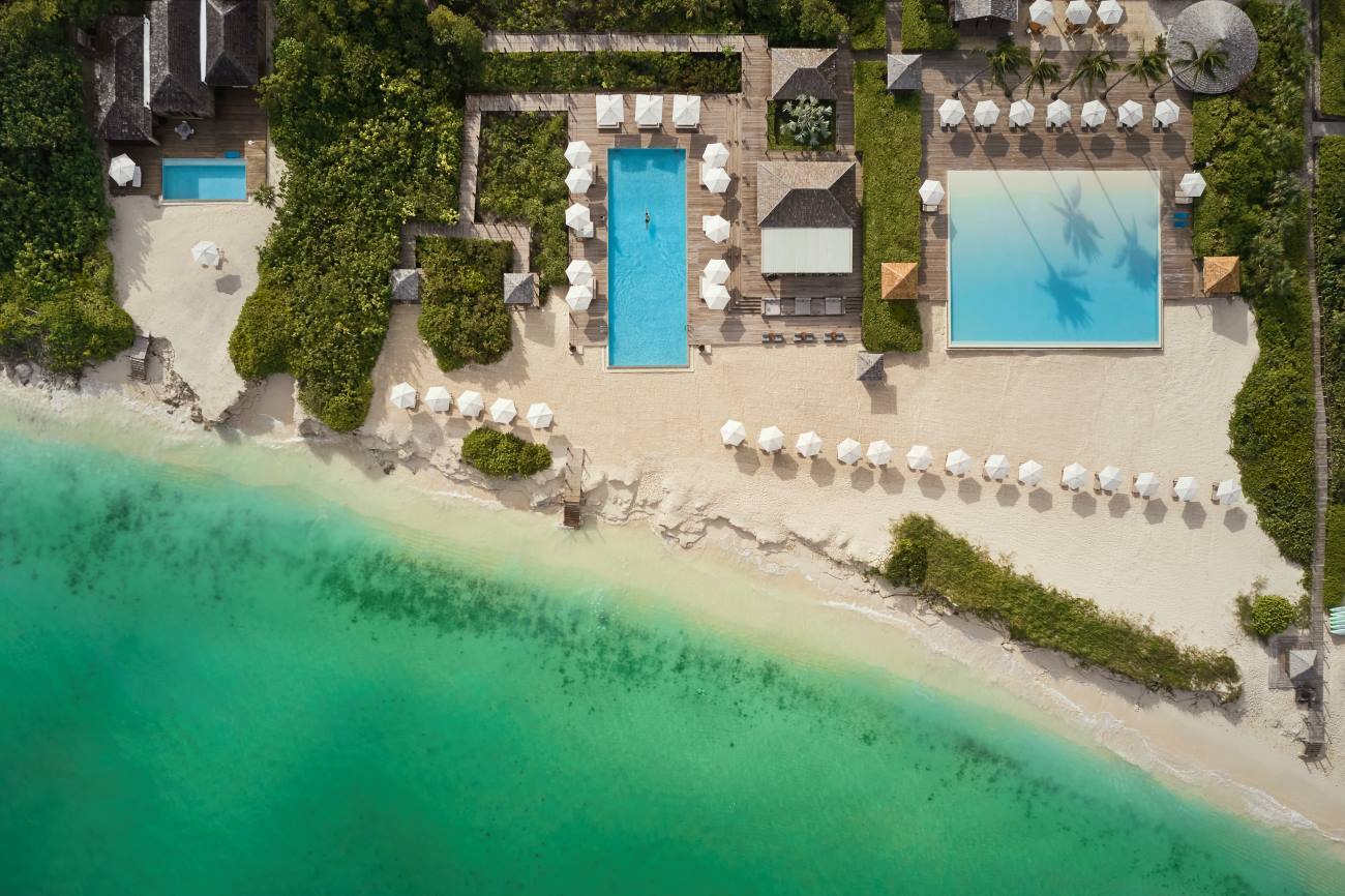 White wisps of cloud fleck the sky, an almost-perfect aquamarine canvas where the sun, a gleaming tangerine disc perched high above, takes centre stage. The rays beam down, throwing dappled light across the terrace, where a table is bestowed with a lavish lunchtime spread. Platters of fresh seafood and rainbow-coloured salads are delivered by waiters floating around us in total harmony, a feast complemented by glasses of chilled rosé and the happy hum of conversation. This is only our third day in the Turks and Caicos Islands, but I feel right at home. I pause for a moment to take in my surroundings: one of the hotel’s pools sparkles below, ringed by lush greenery and towering palms that gently sway, revealing a glimpse of the crystal-clear ocean beyond.