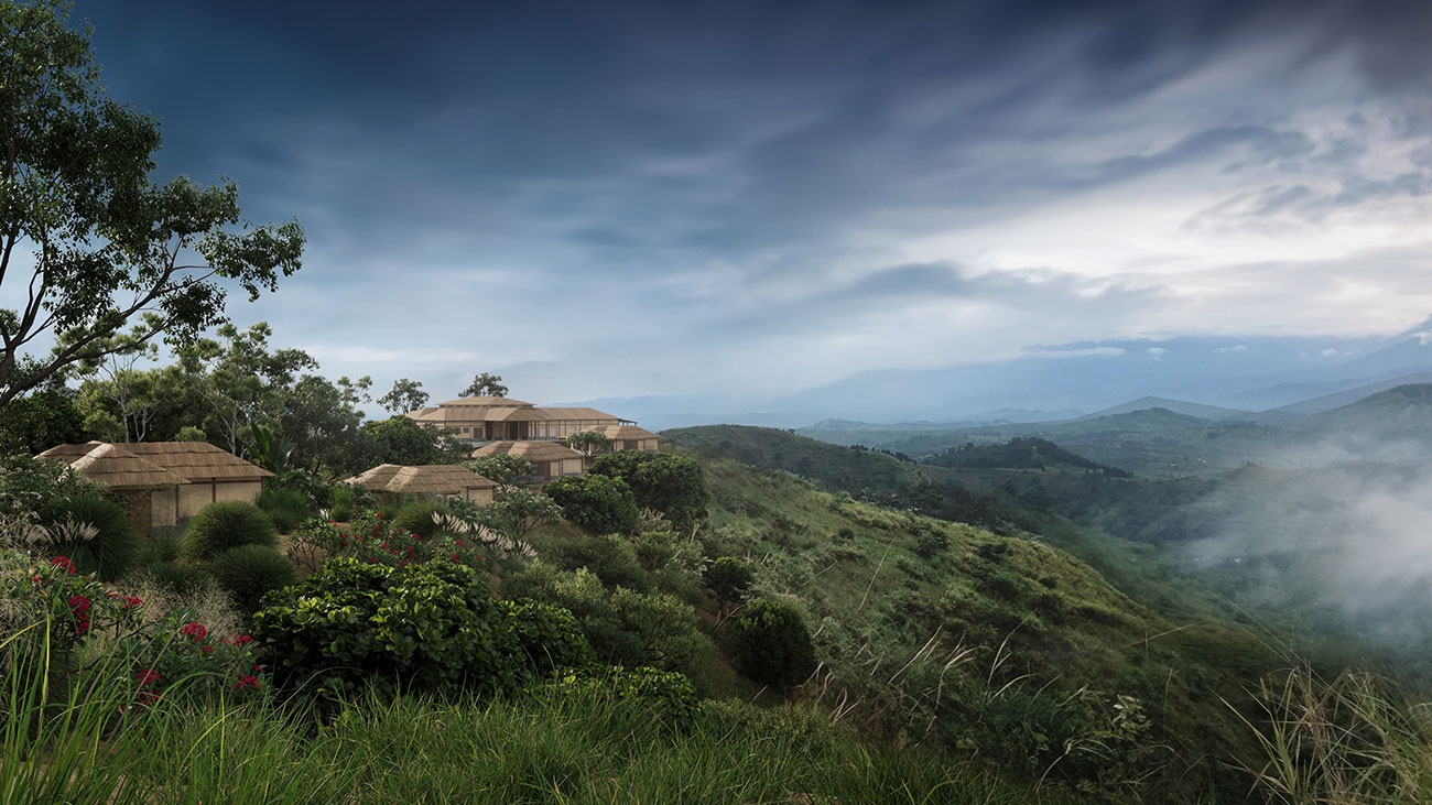 The 150-acre site is dominated by a rocky outcrop with views of the Rwenzori Mountains to the west and the Queen Elizabeth plains and the Kazinga channel to the south.