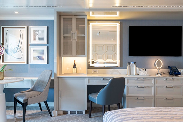 The facts: When Oceania Cruises launched 20 years ago, its mantra was the finest cuisine at sea – and Vista looks to continue that with one chef for every 10 passengers and a range of complimentary restaurants. Long-standing favourites Polo Grill (steaks), Toscana (Italian) and Red Ginger (Asian) are joined by two new venues. Aquamar Kitchen, open for breakfast and lunch, serves salads, wraps and soups. Ember, a speedy alternative to fine dining, majors on burgers, steaks, and mac and cheese. Add the Grand Dining Room and Terrace Café, plus Waves’ burgers and pizzas, and room service, and you can eat somewhere different every day of the week and still not have tried everywhere. For something more exclusive, passengers can pay extra for a private dining experience for up to eight people in Polo Grill or Toscana. In Privée, there is a choice of the seven-course wine and food-pairing Odyssey menu ($150 plus 20% gratuity) and six-course Dom Pérignon tasting experience with three vintage champagnes ($395 plus tip). Other tweaks include the introduction of a bakery in Baristas, a larger Culinary Center and new chef’s studio for cookery demonstrations. Passengers can also learn photo editing and social media in the Digital Center. The biggest change is that inside cabins have been scrapped and the space they occupied used to add depth to the rest of the accommodation – most notably, adding bathrooms that in size are more akin to what you’d expect in a suite, with big glass-enclosed showers. Most cabins have balconies (20 have floor-to-ceiling windows that open to a rail so you can get fresh air in but can’t step outside). The rooms feel spacious and airy, but storage is limited, with a wardrobe, two drawers at desk height and no shelves. There are also six Concierge-class single cabins – a first for Oceania. For more square feet, suite categories range from Penthouses to three apartment-like Owners’ Suites. These span the width of the ship, feature Ralph Lauren furnishings and rival rooms in the best luxury hotels – with the bonus of providing a different view every day. Suites come with perks including free laundry, butler service and access to an executive lounge.