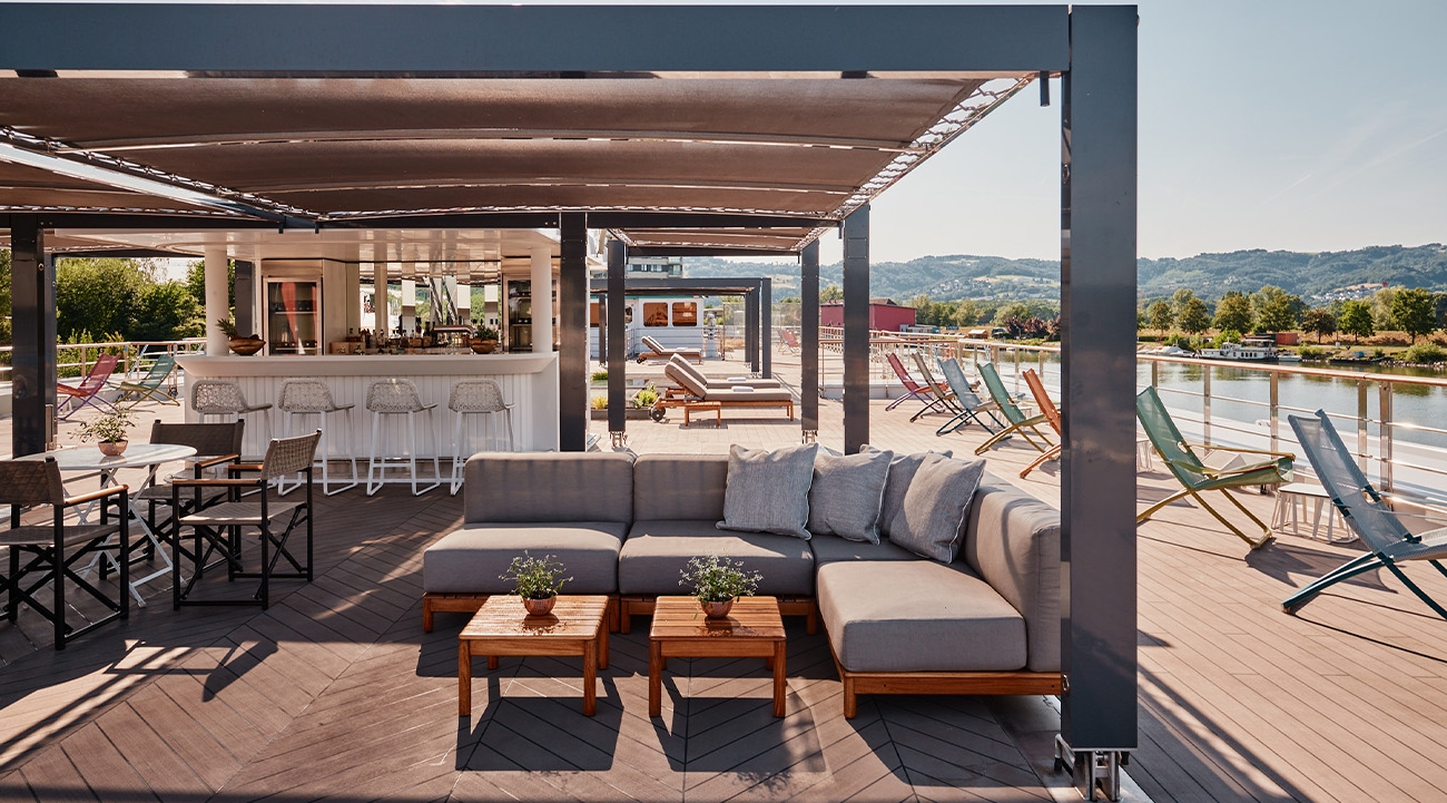 The Marketplace, Blue, the Bistro and sundeck BBQ are variously open for breakfast and lunch; for dinner it’s Waterside. There’s also the exclusive Vintage Room, which holds 12 people and costs €295 for seven courses with wine, or tapas in the bistro. Entry-level suites from 219sq ft are a third larger than on traditional river ships.