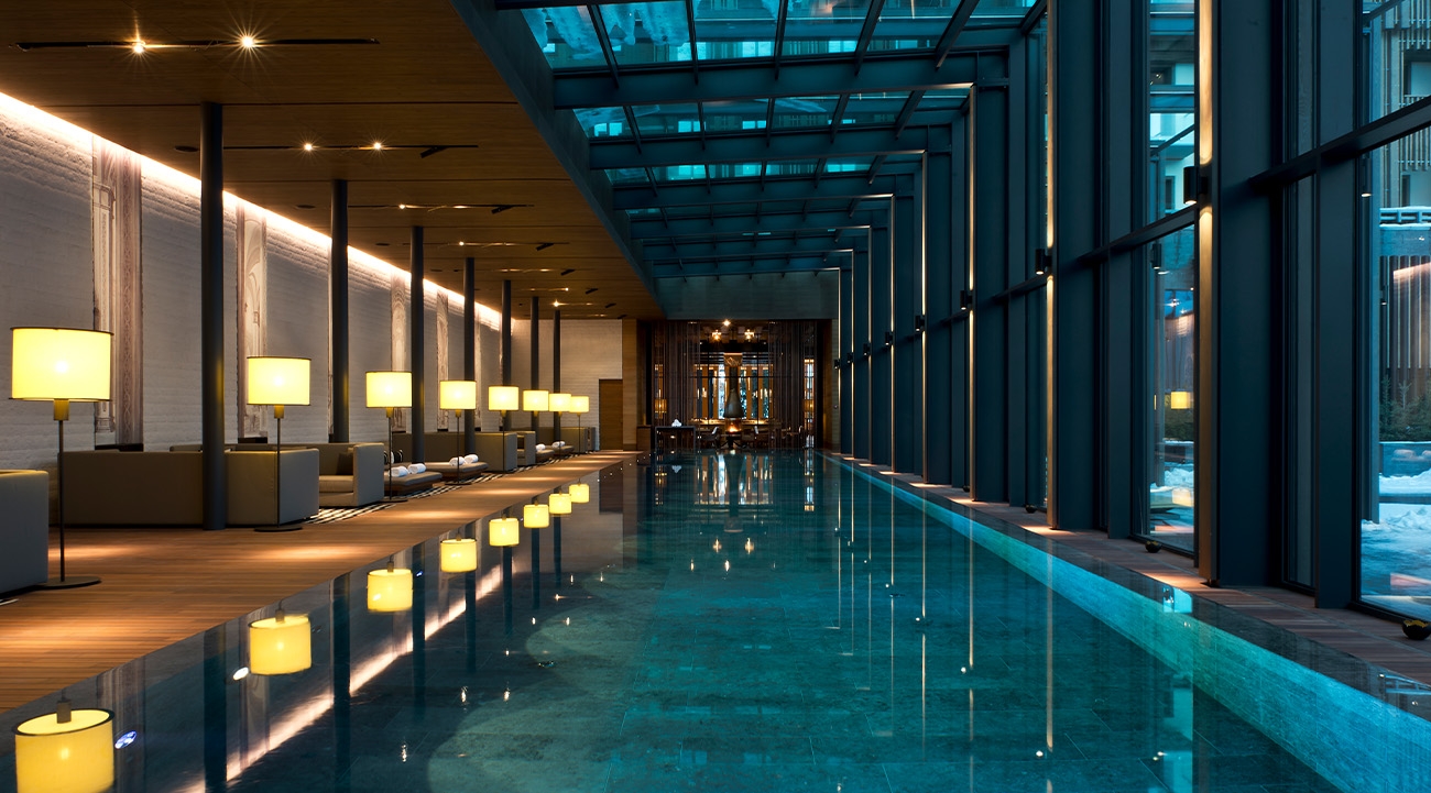 The property is home to the world’s largest hotel collection of cigars; a five-metre-tall room filled with Swiss cheeses; and a wine cave stocked with some of the best and oldest vintages. The spa is a big draw, with a 35-metre swimming pool that looks out over snowy peaks, as well as an outdoor pool, hydrothermal baths and products from beauty brand Tata Harper.